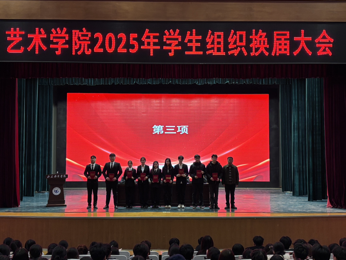 为进一步加强学生组织建设,保障学生工作的连续性与创新性,2025年11月30日晚,山东航空学院艺术学院2025年学生组织换届大会于学院礼堂隆重召开。学院党委副书记秦玉国,学生科主任韩栋梁,辅导员刘静、段兆岢、房庆等老师出席本次大会,大会由韩栋梁老师主持。