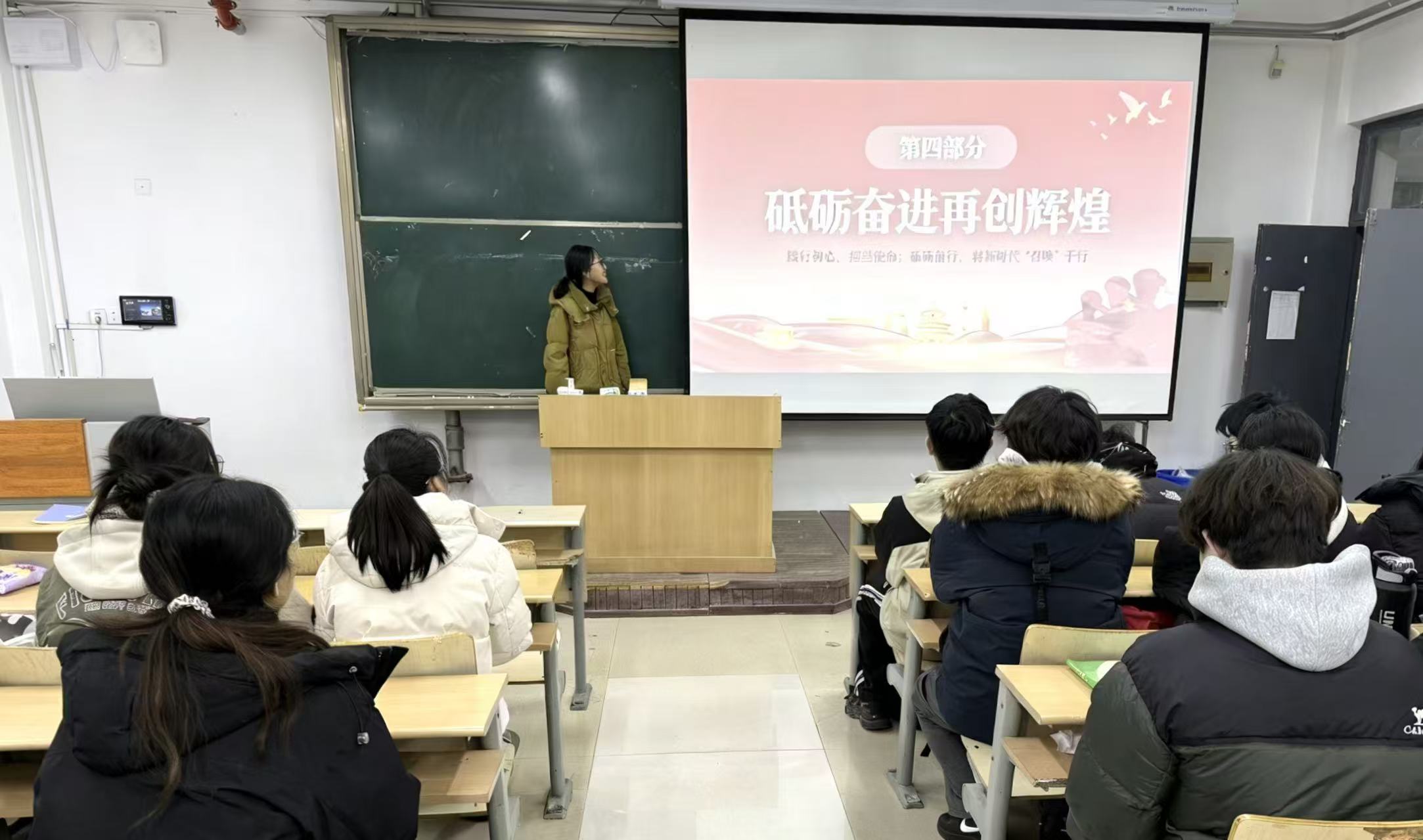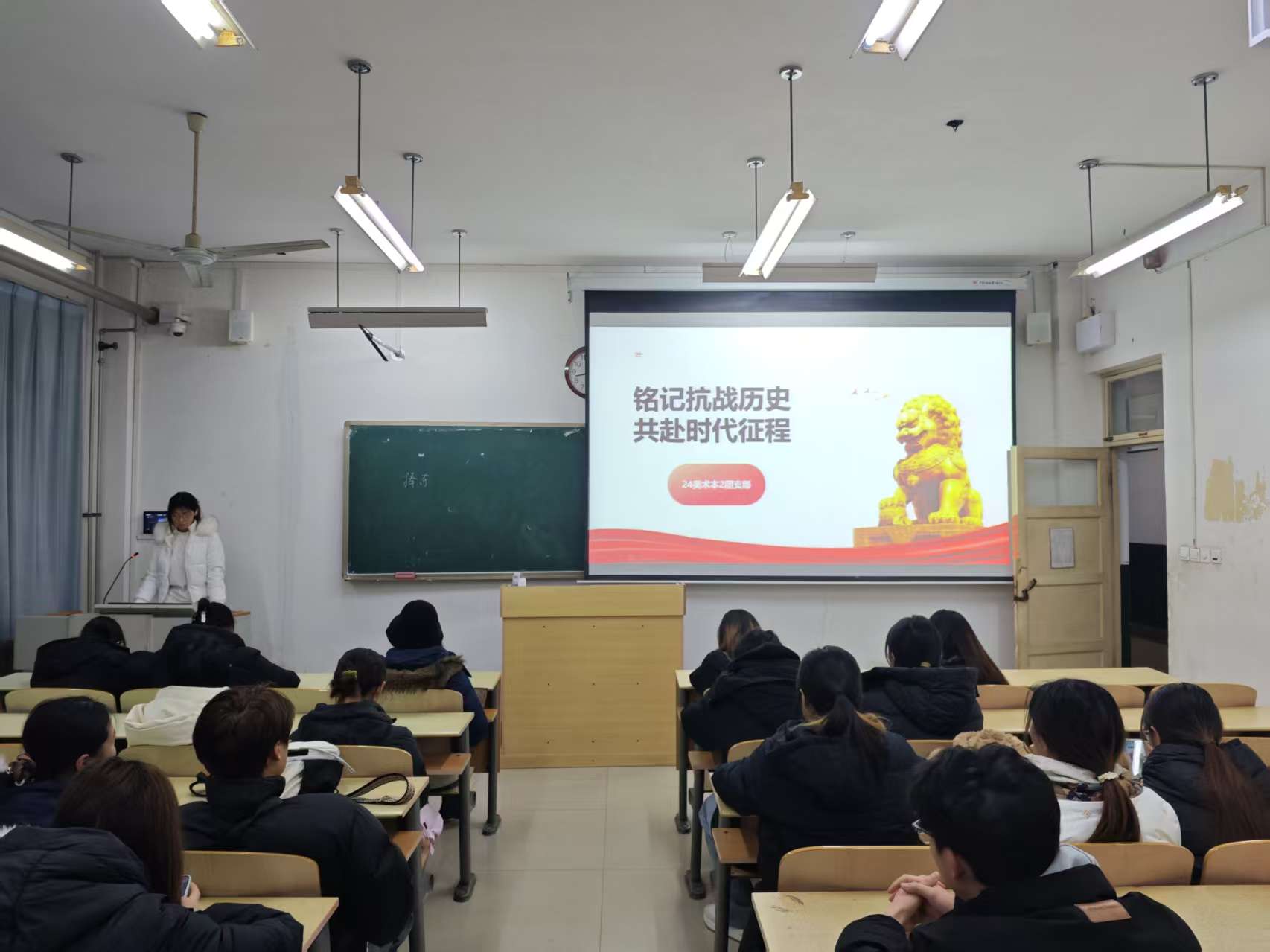 活动现场,团员们先聚焦抗战历史脉络学习,团支书通过PPT梳理九一八事变至抗战胜利的关键节点并结合史料讲解背景与意义,“历史脉络”专题为后续研讨筑牢基础;随后专题学习核心环节以“铭记抗战历史 共赴时代征程”为主题,团支书带团员们领回顾狼牙山五壮士、杨靖宇等英烈事迹,大家结合抗战影片片段与自身感悟发言分享红色故事,在交流中体会英烈爱国情怀与不屈意志,实现抗战精神的青年传承与情感共鸣。