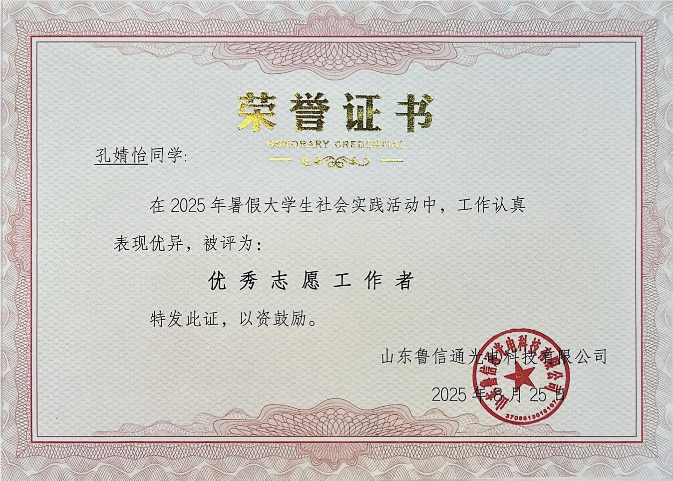 5.企业实践的志愿标杆:在山东鲁信通光电科技有限公司的实践中,协助整理企业青年员工活动档案、参与车间安全宣传,因工作细致被评为“优秀志愿工作者”。