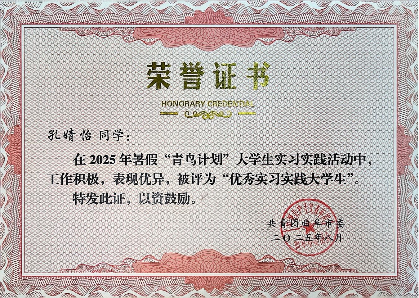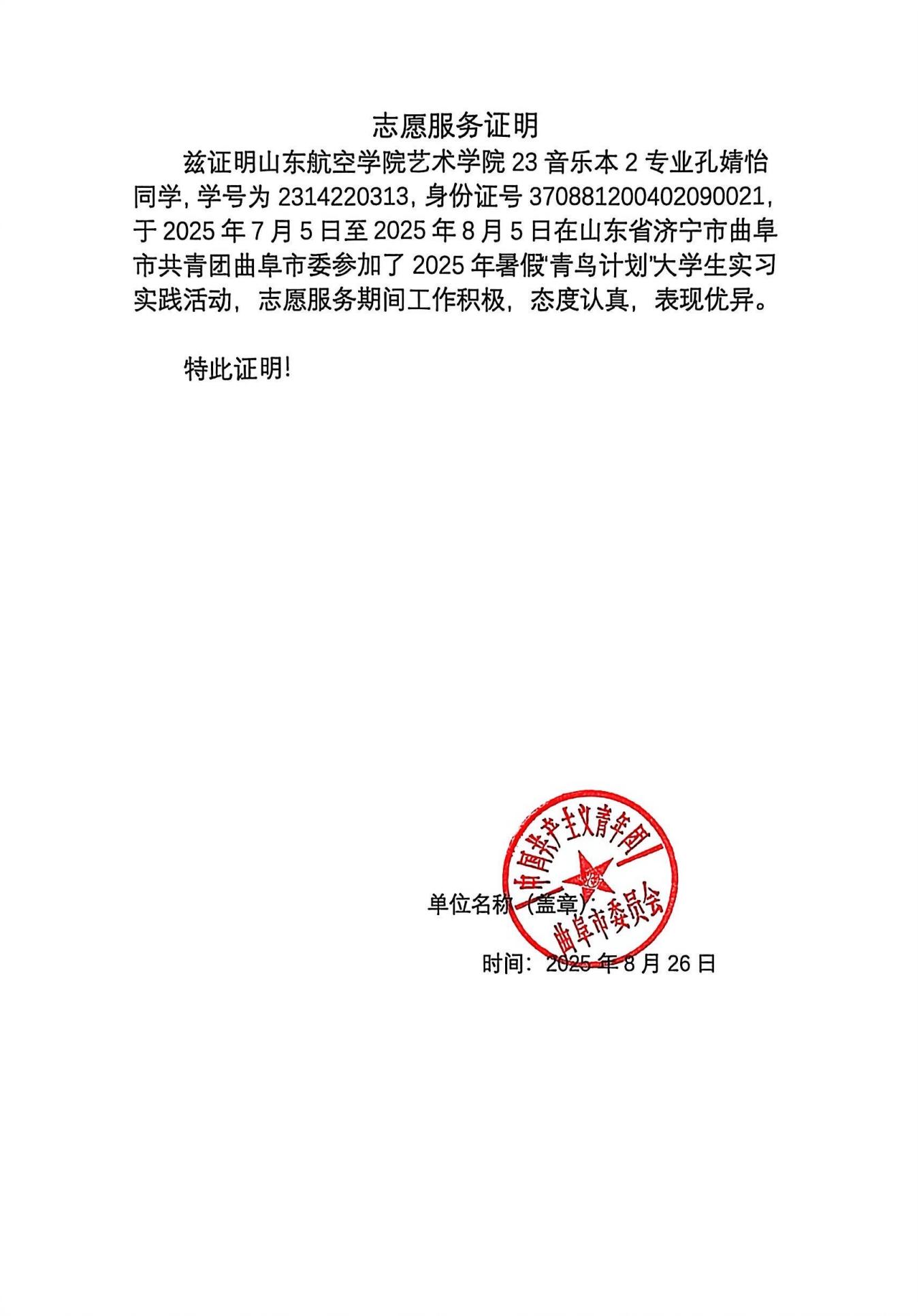 作为山东航空学院23级音乐学(师范类)专业2班的学生,她在2025年7月5日至8月6日以“青鸟计划”实习生身份,在共青团曲阜市委参与了7项核心实践: