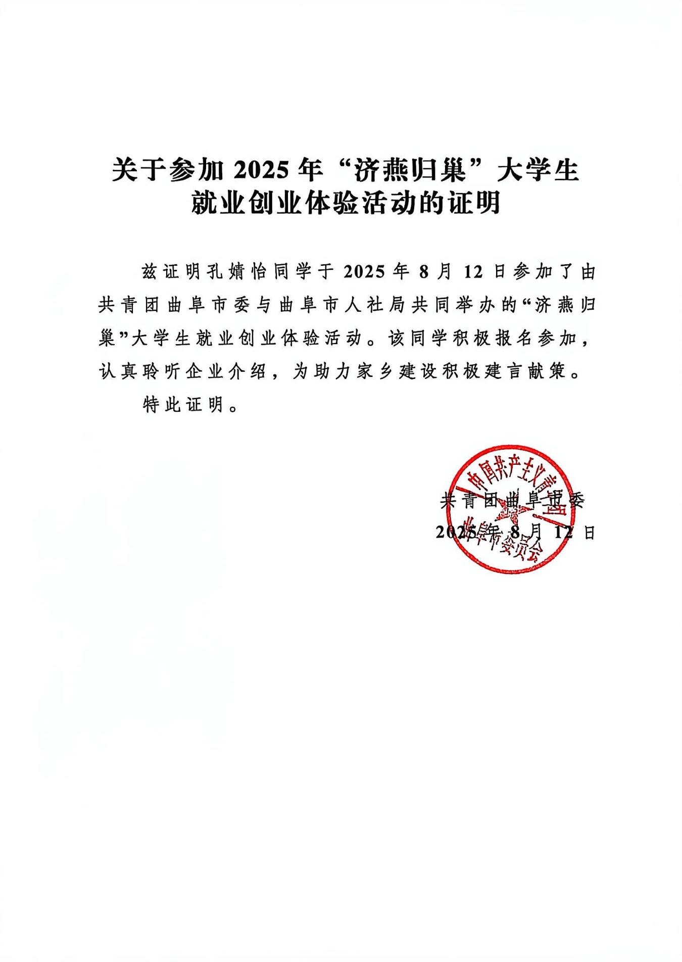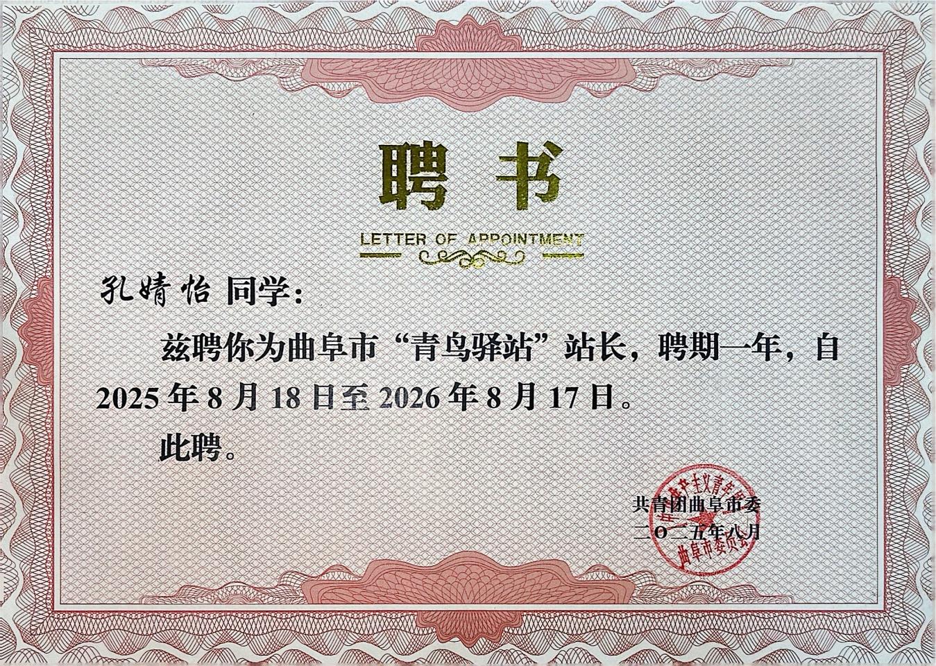 “青鸟归巢,非为栖止”——这段经历让她把“家乡”从“籍贯”变成了“事业坐标系”:后续她计划以“青鸟驿站”为纽带,联动高校社团开展“曲阜文旅创意设计大赛”,用青年创意为家乡文旅赋能;同时持续关注家乡非遗项目,尝试用音乐编曲的方式,把传统技艺的韵律转化为现代音乐作品,让家乡文化以更年轻的形态传播。
